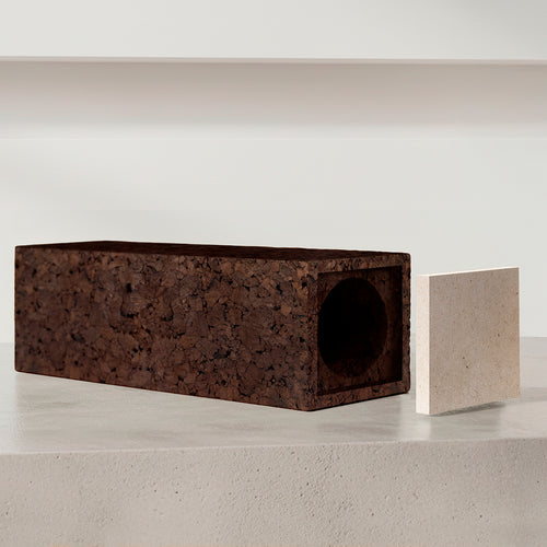 O corpo de cada módulo é feito de cortiça expandida. Um produto 100% natural, onde a ligação entre os grânulos da matéria-prima se estabelece unicamente através da expansão volumétrica e da exsudação das resinas naturais da cortiça, resultantes da ação térmica do vapor de água a mais de 400 graus. A tampa é uma pedra natural moleanos. Um calcário português, extraído sobretudo na região de Alcobaça (Serra dos Candeeiros). É uma pedra sedimentar, formada a partir de depósitos marinhos ao longo de milhões de anos.