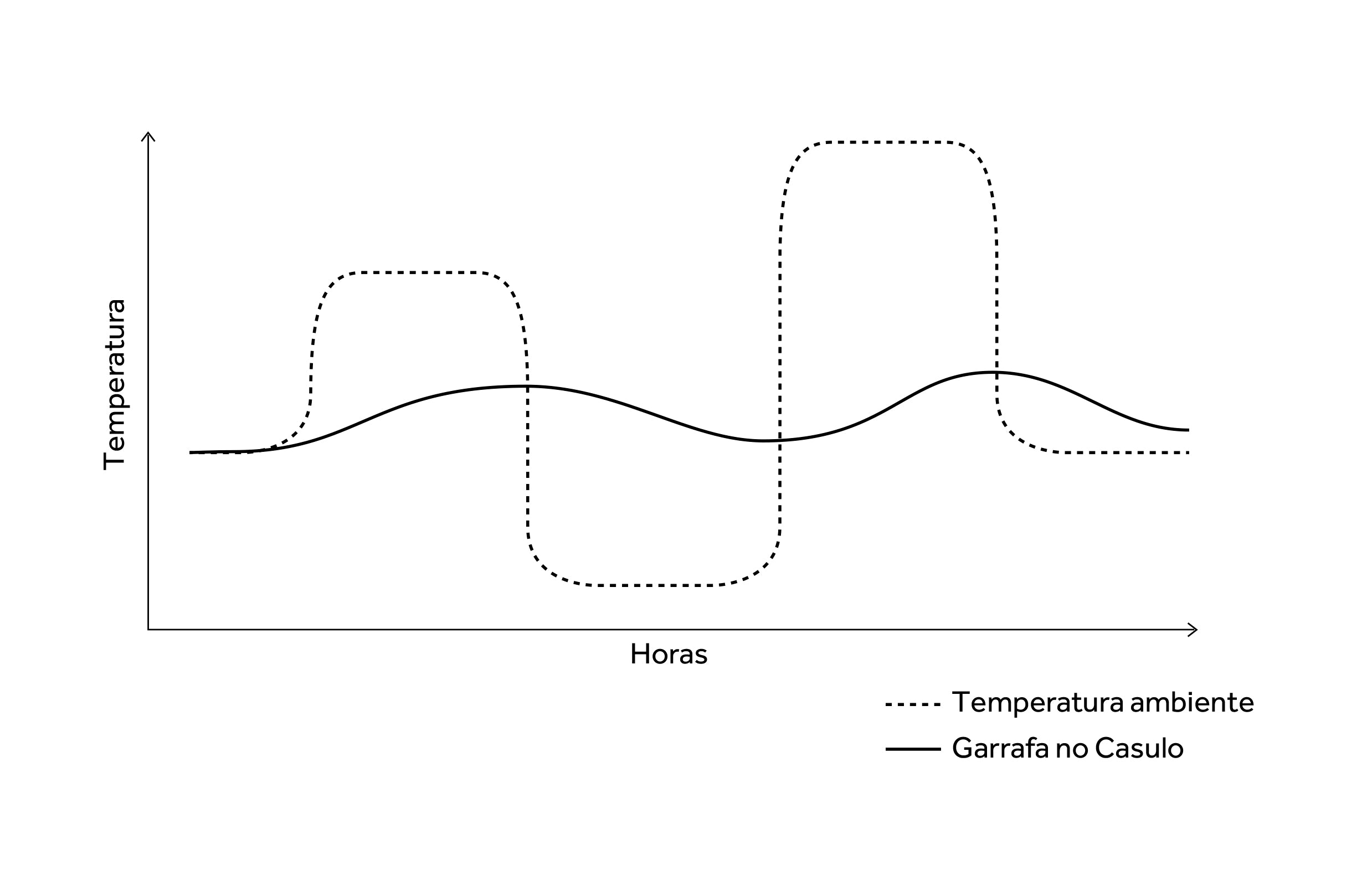 Esta garrafeira protege o vinho das variações bruscas de temperatura. Como demonstra o teste, enquanto o ambiente sofre oscilações rápidas e extremas, a garrafeira funciona como uma massa térmica estável, atrasando e suavizando a transmissão do calor e do frio para a garrafa. O resultado não é uma temperatura artificialmente controlada, mas uma redução clara dos choques térmicos, mantendo o vinho fora da zona de stress que acelera o envelhecimento, degrada aromas e compromete a evolução natural do vinho ao longo do tempo.